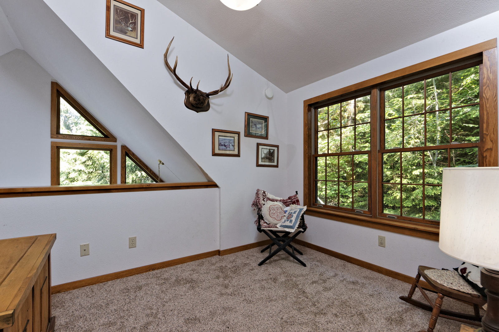 Follow the re-purposed old schoolhouse railing to the upstairs loft landing that overlooks the great room and out to the ever changing views. Also upstairs is the master bedroom with walk in closet, a view, and full bath with jetted tub.